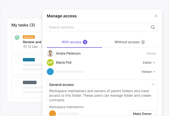 ApprovalCollaborate in real time with roles, chat-like reviews, and AI-powered contract analysis.