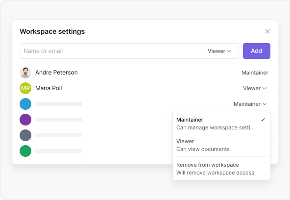 Control visibility like never before. Set up private workspaces with fine-grained access permissions — decide with your admin who can view, edit, or manage folders and documents. Assign roles like admin, editor, or viewer for each area to keep sensitive documents protected while enabling efficient teamwork.