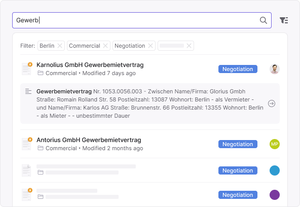 Use powerful full-text search and advanced filters to locate contracts by title, content, contract type, involved parties, due dates, or tags. No more endless clicking through folder trees. Whether you’re prepping for a meeting or answering a legal inquiry, you’ll always have the right contract at your fingertips.