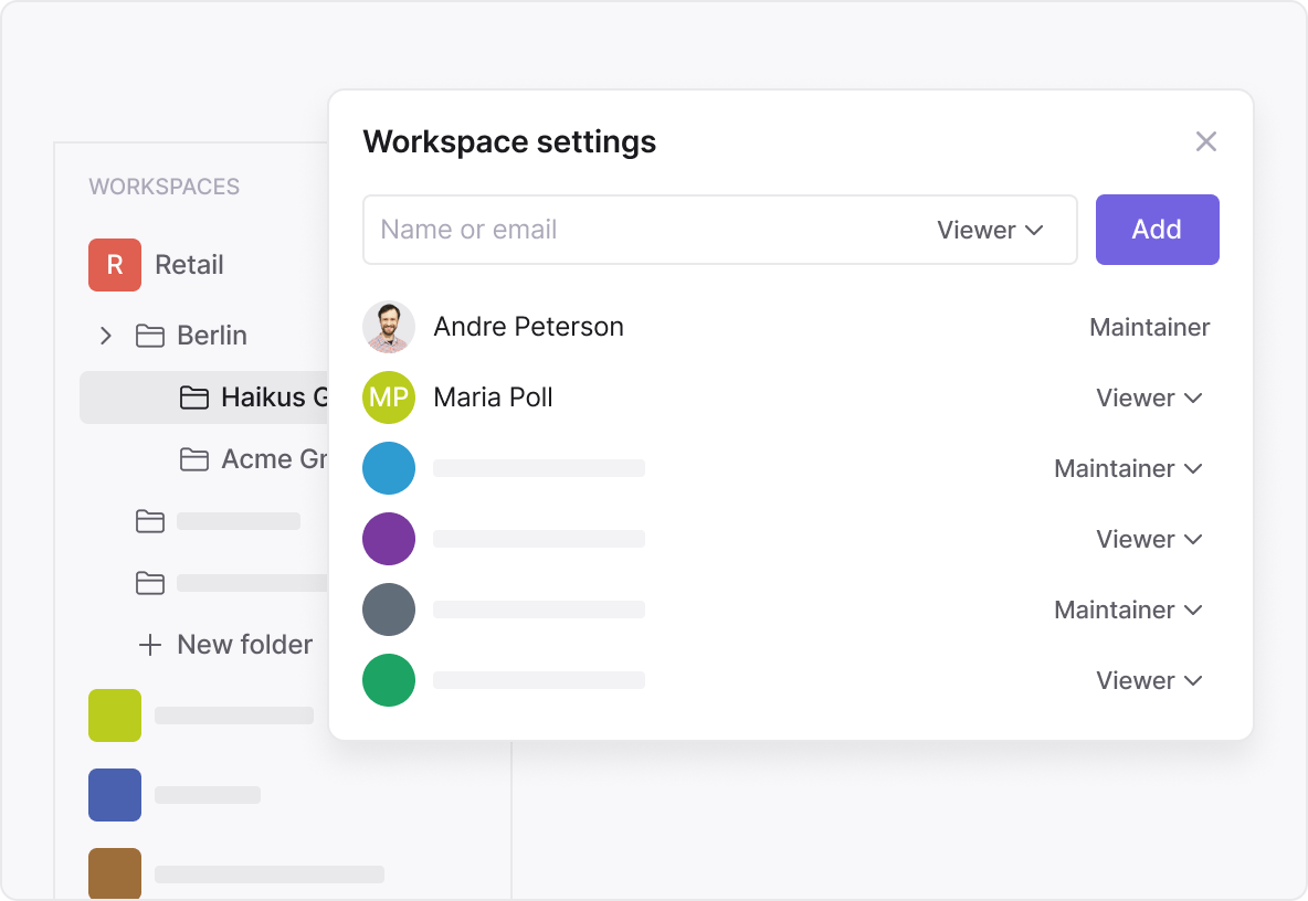 Simply click on “Create Workspace,” name your workspace, and assign relevant team members with specific roles and permissions. It takes less than a minute to set up a secure, dedicated space for your team.